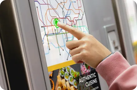 Provide live route maps, station alerts, door-side indicators, safety messages, and promotional content during the journey.